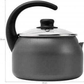Peso: 640g / Cor: Cinza / Ref: 53518 Dimensões: 20cm (C) x 18cm (L) x 19cm (A) Dimensão base inferior: 17cm (D) Dimensões internas superiores: 14cm (D) x 10cm (A) Espessura chaleira: 2mm Dimensões tampa: 15,5cm (D) x 5cm (A) Dimensões área de uso alça: 5cm (A) Capacidade: 2,4 litros Capacidade máxima para uso: 2/3 de sua capacidade total. Compatível com fogão: A gás, elétrico e vitrocerâmico. Conteúdo: 01 chaleira antiaderente.