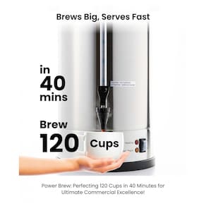 Chaleira comercial em aço inoxidável 304 de grau alimentício, com capacidade de 18 litros (120 xícaras). Possui bico anti-gotejamento, indicador visual de nível de água, base antiderrapante e filtro reutilizável. Certificada ETL pela Intertek.Acessórios