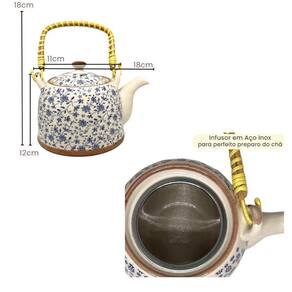 Chaleira de porcelana estilo oriental estampa floral e alça de madeira estilo rústico. Acompanha tampa e infusor/coador que se encaixa na borda, facilitando o preparo do chá. A alça e coador pode ser removida para lavagem. Dê uma toque oriental no seu chá e decoração. É uma excelente opção para presentear. Se desejar um modelo específico, favor mandar no campo de mensagem o modelo desejado, senão será enviado o modelo disponivel no . Especificações: Material: Chaleira: porcelana; Infusor: aço inoxidável; Alça: madeira rustico; Não pode ser no fogo. Dimensões: 18 cm comprimento com bico ; 14,5cm diâmetro ; 11cm altura com tampa ; Altura aproximada com a alça: 19cm; Capacidade: 900ml; Características gerais do produto: Acompanha o produto: 01 chaleira bule Marca: Não Informado Ean: 7908076243518