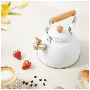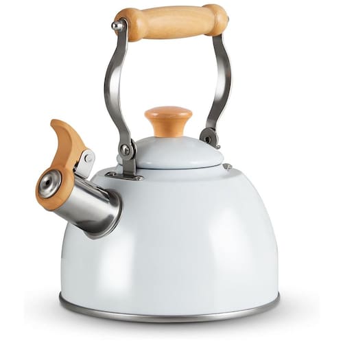 Estrutura durável Esta chaleira é feita de aço inoxidável 304 de alta qualidade, garante resistência à ferrugem e corrosão. Os materiais são de qualidade alimentar profissional e você pode desfrutar de anos de uso com segurança Cabo de madeira maciça Cabo de madeira maciça e cabo da tampa permitem que você pegue a chaleira com as mãos nuas sem risco de queimaduras. A forma ergonômica e o design maximizam seu conforto para levantar, despejar e preencher Material resistente ao calor A chaleira é revestida com pintura de alta temperatura, não desbota e é fácil de limpar. A prensa de bico de baquelite protege suas mãos do calor e possibilita o derramamento com uma mão Aplicar a vários fogões de mesa Alta qualidade 18, 8 de aço inoxidável é adequado para qualquer fonte de calor, incluindo fogão de indução, forno elétrico, fogão a gás e gás natural. Use esta chaleira em fogo pequeno ou médio, ela aquece muito rápido e economiza energia Dicas Não deixe a chama queimar o revestimento externo diretamente Por favor, evite queimar vazio, porque esta chaleira aquece muito rápido certifique se de que a tampa da chaleira e a tampa do bico estão completamente fechadas e não encha demais a chaleira, ou o apito pode não funcionar