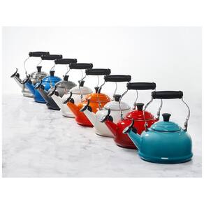 Feito de aço carbono leve para ferver rapidamente a água. O esmalte de porcelana vibrante é não reativo, não poroso e resiste a manchas, ferrugem, arranhões e absorção de sabor. Corrigidos alertas de apito de tom único quando a água atinge o ponto de fervura, e podem ser facilmente abertos para despejar. Marcações convenientes dentro das chaleiras indicam os níveis mínimo e máximo de enchimento de água. Alças pretas e suportes de alça de aço inoxidável garantem um manuseio . Compatível com todos os cooktops. Lavar à mão com água morna e sabão Marca: Não Informado
