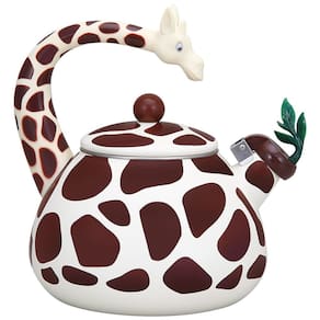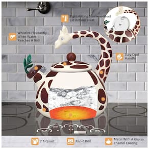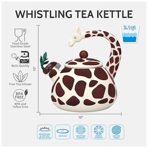 Material Aço inoxidável de calibre pesado com acabamento em esmalte. Cuidados e limpeza os esmaltes podem ser lavados na lava louças no entanto, recomendamos lavar à mão com sabão neutro e secar imediatamente para preservar o acabamento. Inclui chaleira de assobio de girafa de 1 peça. Apresentando a adorável chaleira esmaltada Giraffe. Escolha sua chaleira favorita hoje e aproveite sua vida na cozinha Com um design muito adorável, esta chaleira adicionará diversão à sua cozinha e trará um sorriso ao seu rosto sempre que você ferver água Esses designs vêm em uma linda caixa de presente, será uma ótima ideia de presente para o seu ente querido. É feito de esmalte sobre aço dentro e fora da chaleira. A alça, o bico e o botão da tampa são feitos de plástico durável