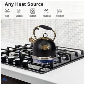 Design de aço inoxidável todo o corpo da chaleira é feito de aço inoxidável, o corpo grosso tornando o mais durável e resistente. Fundo de metal de 5 camadas com alta condutividade térmica para aquecimento mais uniforme e vida útil mais longa. Som de assobio perfeito da chaleira esta chaleira para fogão tem uma tampa apertada que mantém o vapor na chaleira quente para aquecimento rápido e apitos agradáveis quando a água ferve, alto o suficiente para alarmá lo quando você estiver ocupado no próxima sala. Bule de gatilho de uma mão Este bule de chá para fogão com mecanismo de gatilho de uma mão que permite uma operação conveniente com uma mão. Sutable para vários fogões Bule adequado para qualquer fonte de calor, incluindo fogão de indução, fogão elétrico, fogão a gás, fogão radiante. Por favor, use fonte de calor médio e prolongue a vida útil, caso contrário, queimaria a chaleira e descoloriria a superfície do corpo