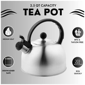 Acabamento exterior elegante Feito com aço inoxidável resistente ao calor premium, sua chaleira de apito de longa duração pode suportar o uso a longo prazo e todos os dias. Seu acabamento em aço inoxidável é fácil de manter limpo e arrumado e é uma adição atraente para a decoração da sua cozinha. 100 livre de teflon e livre de BPA. Chaleira de assobio pode aquecer e fervura rápida com grande capacidade 2,5 litros de água ou líquido para o seu chá. Despeje até 10,5 xícaras de líquido desta chaleira Alça ergonômica de empunhadura fria Alça à prova de calor As curvas formadas da alça também garantem a segurança ao despejar, então não importa o quão quente a base fique, suas mãos e dedos ficam protegidos livres do calor e do vapor Agradável som de assobio quando a temperatura ideal é alcançada, com apitos de um tom para lembrá lo da chaleira fervida quando você não estava na cozinha. O bico de pressão com o polegar facilita o derramamento, basta inclinar, abrir e despejar em um único movimento Marca: Não Informado