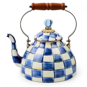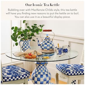 CHALEIRA ROYAL CHECK Esta chaleira quadriculada tem uma parte inferior de aço de calibre pesado vidrada com cheques coloridos pintados à mão em uma variedade de tons de azul. Com uma alça de madeira e uma tampa encimada por um elegante puxador de vidro azul, ela está vestida com esmero Chaleira de chá exclusiva oferecemos nossa linda chaleira em uma variedade de cores e padrões. Esteja você desfrutando de uma xícara de chá casual à tarde ou dando uma festa elegante, você pode tornar cada dia extraordinário com MacKenzie Childs. CONJUNTO DE COZINHA DE ESMALTE Combine sua adorável chaleira para uso no fogão com nossa grande variedade de peças de louça Oferecemos canecas de café combinando, pratos de jantar e salada e muito mais. Desfrute de padrões únicos e visuais impressionantes com MacKenzie Childs. UM PRESENTE PERFEITO A clássica chaleira esmaltada da MacKenzie Childs é muito mais do que um presente é o começo de uma coleção para toda a vida. É um presente incrível de Natal, aniversário, casamento ou inauguração de casa. MACKENZIE CHILDS A MacKenzie Childs nasceu do nosso amor pelo lar e do nosso compromisso com um design e inovador. Cada peça criada por nossos artesãos guarda a surpresa e a alegria do inesperado Marca: Não Informado