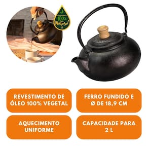 Chaleira em ferro fundido com alça e tampa. Revestimento em óleo 100% orgânico. Compatível com fogões a gás, a lenha, elétricos e cooktops de indução.Acessórios