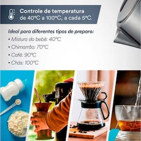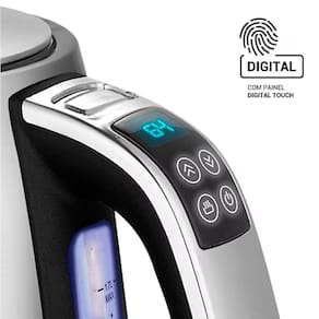 A Chaleira Elétrica EOS 1,8 Litros Inox combina design moderno e praticidade, tornando o preparo de bebidas quentes mais rápido e eficiente. Com estrutura em inox e painel Digital Touch, ela permite controle preciso da temperatura para diferentes usos, garantindo água sempre na temperatura ideal. Com alta potência de 1.500W essa chaleira aquece rapidamente até 1,8 litros, ideal para toda a família. Seu botão de abertura automática da tampa facilita o manuseio, enquanto a função Keep Warm mantém a água aquecida após atingir a temperatura desejada, proporcionando mais comodidade no dia a dia.