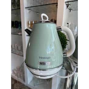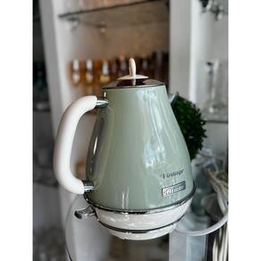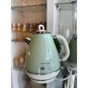 Chaleira elétrica vintage verde com capacidade de 1.7L, potência de 1500W, desligamento automático e base 360º. Ideal para aquecer água para café, chá e chimarrão.Características