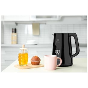 Chaleira elétrica com controle de temperatura variável, função Keep Warm, visor digital, 5 temperaturas predefinidas, operação fácil com um toque, desligamento automático, base giratória 360°, design sem fio, parede dupla com interior em aço inoxidável SUS316 e exterior de toque frio. Capacidade de 1,7 L. Proteção contra fervura a seco. Timer embutido.Acessórios