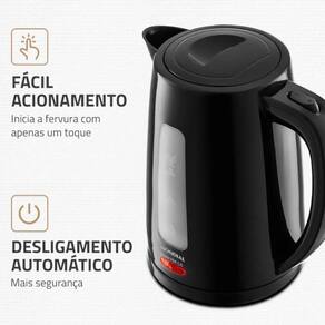 Produto: chaleira elétrica 1,7 litros 1850 watts pratic hot - ce-17 marca: mondial voltagem: 220vdescrição: a chaleira elétrica 1,7 litros 1850 watts pratic hot ce-17 da mondial é perfeita para facilitar o seu dia a dia na cozinha com 1,7 litros de capacidade, preparar bebidas quentes na temperatura ideal ou acelerar o cozimento de alimentos, vai ficar muito mais fácil compacta e portátil, possui fácil abastecimento de água, desligamento automático e alça isotérmica, para mais segurança em sua rotina. Saiba mais sobre a ce-17 da mondial: Capacidade: 1,7 litros a chaleira elétrica mondial aquece a água em poucos minutos e prepara até 7 xícaras de chá de uma vez Versátil: aquece água para preparar café, chá, chimarrão e outros alimentos. Fácil acionamento: inicia a fervura com apenas um toque Visor transparente: melhor visualização durante o preparo. Pode ser usada com pouca ou muita água, de acordo com sua necessidade. Tampa abre-fácil: basta acionar o botão e realizar o abastecimento de água. Portátil: a jarra removível sem fio é ideal para servir à mesa. Alça isotérmica: ergonômica, não aquece e permite o manuseio com mais segurança e conforto. Desligamento automático: o dispositivo de segurança desliga automaticamente após o aquecimento, impedindo que a água ferva até secar. Mais segurança e economia de energia. Porta-fio: mais praticidade na hora de guardar. Lâmpada-piloto: indica o funcionamento do produto. Um ano de garantia mondial: a mondial é a escolha de milhões de consumidores. Mondial, a escolha inteligenteespecificações: modelo: ce-17cor: pretodesligamento automático: simcapacidade em litros: 1,7lmaterial: pptipo de tomada: 10aalimentação: energia elétricapotência: 1850wguarda-fio: nãocomprimento do cabo: 0,85m. Homologação Anatel: 060792000160