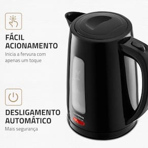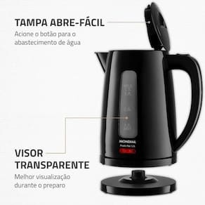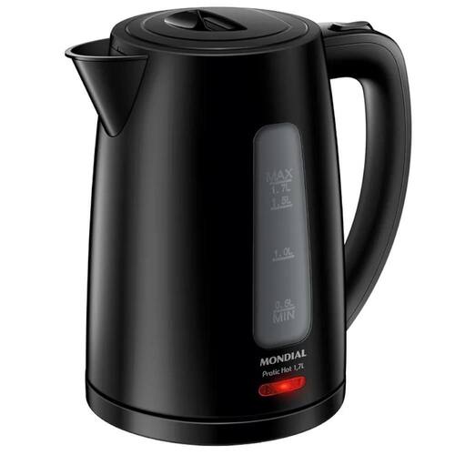 Produto: chaleira elétrica 1,7 litros 1850 watts pratic hot - ce-17 marca: mondial voltagem: 220vdescrição: a chaleira elétrica 1,7 litros 1850 watts pratic hot ce-17 da mondial é perfeita para facilitar o seu dia a dia na cozinha com 1,7 litros de capacidade, preparar bebidas quentes na temperatura ideal ou acelerar o cozimento de alimentos, vai ficar muito mais fácil compacta e portátil, possui fácil abastecimento de água, desligamento automático e alça isotérmica, para mais segurança em sua rotina. Saiba mais sobre a ce-17 da mondial: Capacidade: 1,7 litros a chaleira elétrica mondial aquece a água em poucos minutos e prepara até 7 xícaras de chá de uma vez Versátil: aquece água para preparar café, chá, chimarrão e outros alimentos. Fácil acionamento: inicia a fervura com apenas um toque Visor transparente: melhor visualização durante o preparo. Pode ser Utilizado com pouca ou muita água, de acordo com sua necessidade. Tampa abre-fácil: basta acionar o botão e realizar o abastecimento de água. Portátil: a jarra removível sem fio é ideal para servir à mesa. Alça isotérmica: ergonômica, não aquece e permite o manuseio com mais segurança e conforto. Desligamento automático: o dispositivo de segurança desliga automaticamente após o aquecimento, impedindo que a água ferva até secar. Mais segurança e economia de energia. Porta-fio: mais praticidade na hora de guardar. Lâmpada-piloto: indica o funcionamento do produto. Um ano de mondial: a mondial é a escolha de milhões de consumidores. Mondial, a escolha inteligenteespecificações: modelo: ce-17cor: pretodesligamento automático: simcapacidade em litros: 1,7lmaterial: pptipo de tomada: 10aalimentação: energia elétricapotência: 1850wguarda-fio: nãocomprimento do cabo: 0,85m. Homologação Anatel: 060792000160