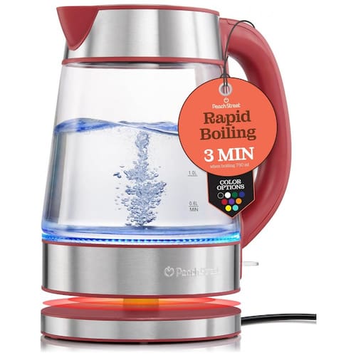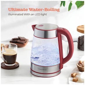 Chaleira elétrica com jarra de vidro, capacidade de 1.7 litros, desligamento automático, fervura rápida, luz indicadora, base giratória 360°, filtro de malha integrado, e design ergonômico.Características