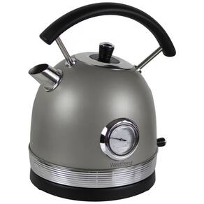 Chaleira elétrica de aço inoxidável com 1500W de potência, desligamento automático, proteção contra fervura seca, base giratória e janela indicadora de nível de água.Características