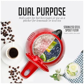 Interior de aço inoxidável de parede dupla Camada com duas folhas de aço inoxidável para manter a temperatura por um período mais longo, mantendo o exterior da chaleira confortável ao toque. Dupla finalidade Esta chaleira não é apenas para ferver, mas também pode ser usada como jarra para suas bebidas frias. Também pode ser para outras bebidas, como sucos e muito mais. Eficiência Energética Alimentado por 1100 Watts 120 V, pode ferver até 1,7 litros de água em apenas alguns minutos, ajudando a economizar mais eletricidade em comparação com o uso de chaleiras tradicionais. Proteção de desligamento automático e fervura Projetado para evitar contratempos com uma função de desligamento automático que é ativada quando atinge o ponto de ebulição ou quando não há água na chaleira. Ele também tem uma luz indicadora de energia para que você possa verificar se a chaleira está ligada rapidamente