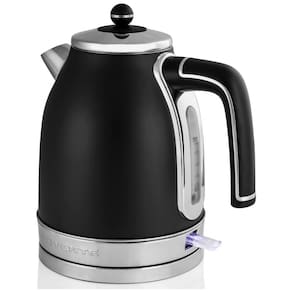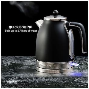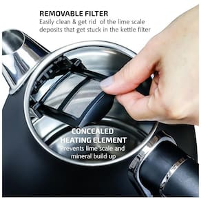 Chaleira elétrica 1.7L em aço inoxidável com desligamento automático e potência de 1500W. Ferve água em minutos, possui alça antiaquecimento e base giratória 360°.Características