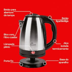 Corpo em aço inox, Base destacável, Desligamento automático, Proteção contra superaquecimentoAcompanha copo