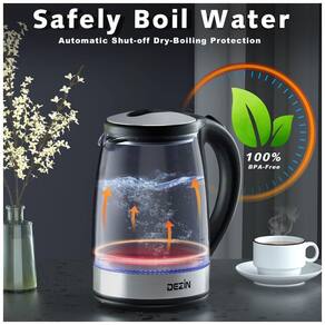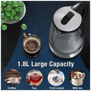 Chaleira elétrica 1.8L, 1000W, corpo em vidro borossilicato, desligamento automático, indicador de nível de água, proteção contra superaquecimento e base giratória.Características