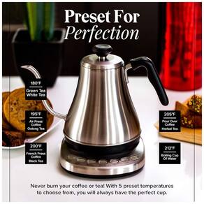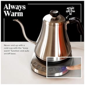 Chaleira elétrica com bico gooseneck, desligamento automático, capacidade de 1 litro, potência de 1000W, corpo em aço inoxidável.Características