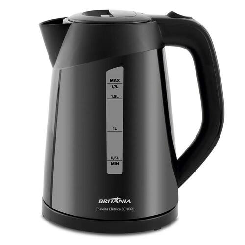 Chaleira Elétrica Britânia com capacidade de 1,7 litros, desligamento automático, portátil, base removível, botão de abertura de tampa e jarra com rotação de 360 graus.Características