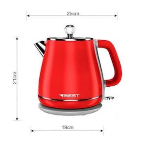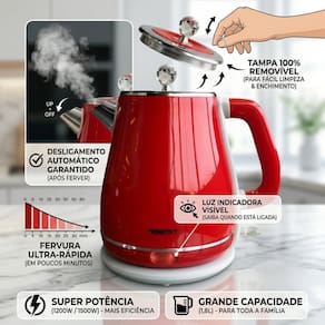 Chaleira elétrica com design moderno e vibrante na cor vermelha. Possui 1500W de potência para aquecimento rápido da água, capacidade de 1,8 litros, desligamento automático ao atingir a fervura, luz indicadora de funcionamento, tampa removível e alavanca Liga/Desliga. Estrutura resistente e durável.Acessórios