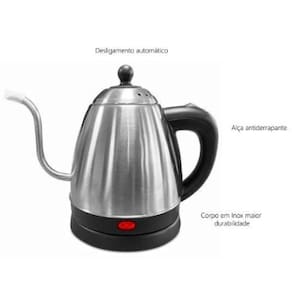 Chaleira Elétrica Bico Fino 1,2L Inox Mimo Style Voltagem: 220V Com a chaleira elétrico bico fino Mimo Style você terá maior controle do fluxo de água para uma bebida mais saborosa, com base destacável, permitindo mobilidade e organização. Possui inidicado LED com aqueciento rápido, alça térmica que permanece fria mesmo com a chaleira aquecida, interior e exterior em aço inoxidável e botão de funcionamento com toque para iniciar o funcionamento. Prepare sua bebidas quentinhas no inverno com mais rapidez e pratiidade Medidas: 20,3 x 25,5 x 15,2 cm Capacidade: 1,2L - Peso: 700g Voltagem: Selecione 127V ou 220V Potência: 800W Frequência: 60hz Material: Inox e Plástico A chaleira elétrica bico fino fornece um fluxo contínuo de água quente, ideal para uma distribuição homogênea, sem respingar. Assim você desfruta de todo o sabor no preparo de suas bebidas quentes Com um design ergonômico da alça faz você se sentir confortável e lhe dá uma boa aderência na garrafa de água. Lembre-se de não ligar o interruptor da chaleira antes de colocar a chaleira na base.