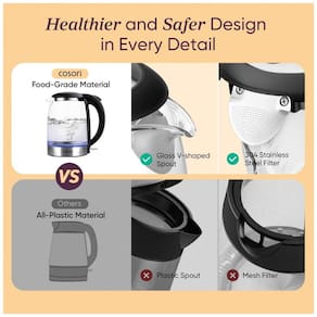 Chaleira elétrica com corpo em aço inoxidável 304 e vidro borossilicato. Possui desligamento automático após a fervura e proteção contra fervura a seco. Abertura ampla para limpeza. Tecnologia British STRIX para fervura rápida (3-7 minutos). Bico em V sem gotejamento e tampa antiqueimadura. Indicador LED azul.Vendido e entregue por Ecletiq