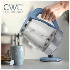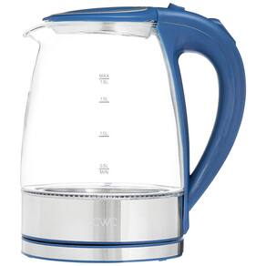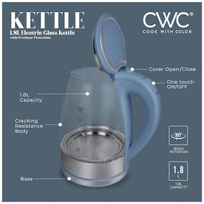 Chaleira elétrica de vidro borossilicato com fervura rápida (1200W), desligamento automático, proteção contra fervura a seco, base giratória 360° e capacidade de 1,8L.Características