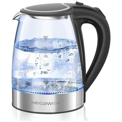 Chaleira elétrica de vidro com capacidade de 1.8L, 1500W, luz LED azul, desligamento automático, proteção contra queima a seco, base em aço inoxidável 304 e design durável.Características