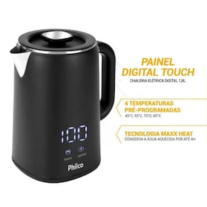 Chaleira Elétrica Digital Philco PCH18B com capacidade de 1,8 litros. Possui display digital, controle de temperatura ajustável de 45°C a 85°C, tecnologia Maxx Heat para manter a água aquecida por até 4 horas, acabamento interno duplo para reduzir a temperatura externa, jarra sem fio com base giratória 360°, e tecnologia Boil Dry para evitar funcionamento sem água.Acessórios
