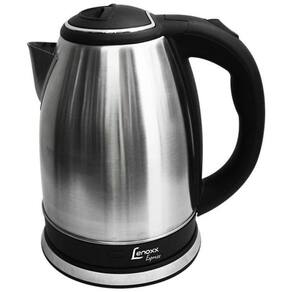 Chaleira elétrica Lenoxx com capacidade de 1.8 litros, desligamento automático, base destacável, alça térmica, jarra sem fio e luz indicadora de funcionamento.
