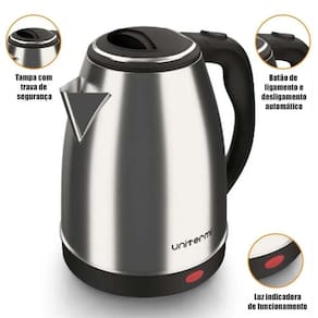 Chaleira elétrica Inox com capacidade de 1,8L, potência de 1200W, desligamento automático e base desCaracterísticas