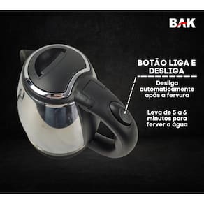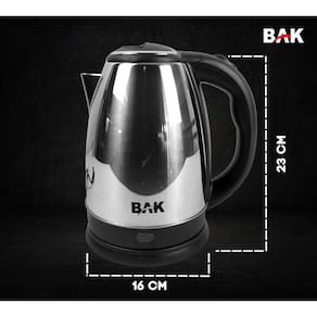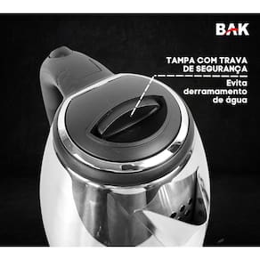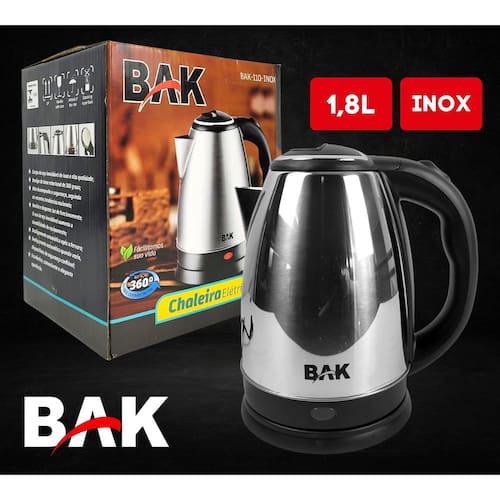 Chaleira elétrica BAK 1.8L em aço inoxidável com desligamento automático, proteção contra superaquecimento e base rotativa 360 graus.Características