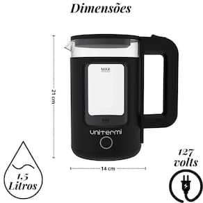Material: Aço inoxidável, PP e vidro.Voltagem: 127V.Potência: 1100W.Capacidade: 1,5 litros.Dimensões: Altura 21 cm x Largura 14 cm.Peso: Aproximadamente 850 g.