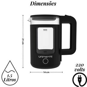 Material: Aço inoxidável, PP e vidro.Voltagem: 220V.Potência: 1800W.Capacidade: 1,5 litros.Dimensões: Altura 21 cm x Largura 14 cm.Peso: Aproximadamente 850 g.