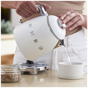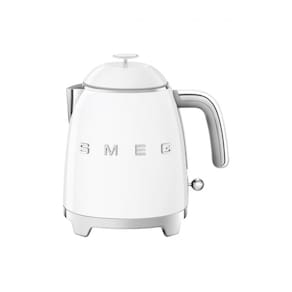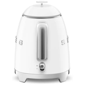 Chaleira elétrica mini Smeg branca retrô com parede dupla, bico antipingos e base 360° antiderrapante.Acessórios