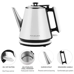 Chaleira elétrica Naibsan 1L em aço inoxidável, com desligamento automático, potência de 1000W e isolamento térmico.Características
