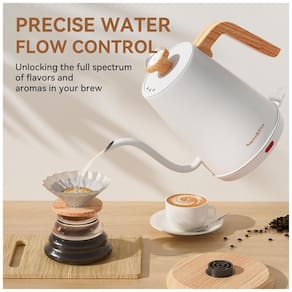 A Chaleira Elétrica Nueve&Five Gooseneck é equipada com termômetro embutido que mostra a temperatura da água conforme ela aquece, ideal para preparar bebidas que requerem temperaturas específicas. Seu design exclusivo permite um fluxo de água preciso e potente, perfeito para um café coado. Com 1000W de potência, ferve 1 litro de água em apenas 5 minutos. Possui desligamento automático para segurança, proteção contra fervura seca e desligamento automático. Feita de aço inoxidável de grau alimentício, fácil de limpar e segura de usar. Perfeita para proporcionar um bom café ou chá a qualquer momento.