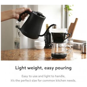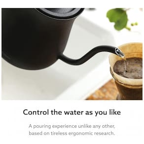 O bico de precisão e a alça ergonômica permitem direcionar o jato de água de forma uniforme, favorecendo métodos filtrados e pour-over. O indicador luminoso em tubo de néon no cabo sinaliza o funcionamento, enquanto a base elétrica destacável simplifica o manuseio na hora de servir.