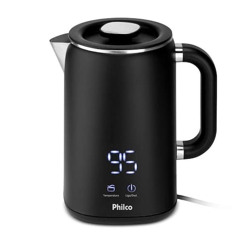 Chaleira Elétrica Philco com capacidade de 1,8L, painel digital touch, 4 temperaturas pré-programadas (45C, 55C, 70C e 85C e 100C), função Boil Dry, corpo com parede dupla e tecnologia Maxx Heat (mantém aquecida por até 4 horas).Características