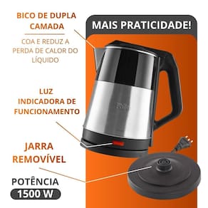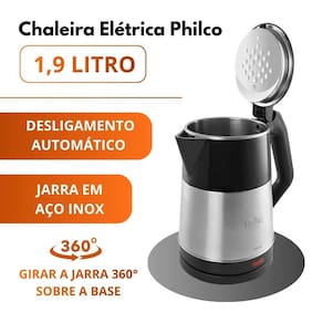 A Chaleira Elétrica Philco PCH13PI 1,9L foi desenvolvida para quem busca praticidade, rapidez e segurança no aquecimento de água no dia a dia. Com jarra em aço inox e capacidade de 1,9 litro, ela é ideal para preparar café instantâneo, chás, cappuccinos, mamadeiras e diversas bebidas quentes. Seu desligamento automático ao atingir o ponto de fervura evita acidentes e contribui para economia de energia, enquanto o sistema de proteção contra superaquecimento garante total segurança durante o uso. A luz indicadora mostra quando o aparelho está em funcionamento, e a jarra removível com base giratória 360° oferece liberdade e facilidade no manuseio. Já o bico com dupla camada e filtro integrado ajuda a manter a temperatura e proporciona um servir mais preciso e seguro.