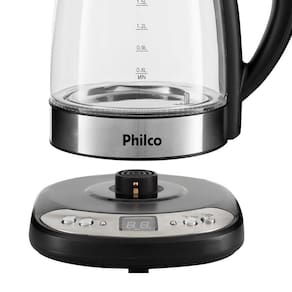 Chaleira Elétrica Philco PCHD 1,7L Digital Glass 220v Com a Chaleira Digital Philco Glass PCHD 1,7L você consegue preparar chás, chimarrão, café instantâneo e muitas outras bebidas quentes de forma prática e eficiente Ela tem capacidade para até 1,7 litros de água fervida, além de fazer isso com rapidez. Também conta com desligamento automático, isso é, quando a água começar a ferver ela desliga sozinha. Ainda possui botão automático de abertura de tampa, evitando acidentes e facilitando na hora de abrir. Por ser portátil e sua jarra não possuir fio ela se torna muito prática, tanto na hora de hora de servir como na hora de transportar. Sua base é destacável com porta-cordão, facilitando o manuseio e armazenamento. Com a Chaleira Digital Philco Glass PCHD 1,7L sua vida fica fácil e segura CARACTERÍSTICAS: - Controles digitais - Capacidade para 1,7 litros - Desligamento automático - Display para indicação de temperatura de 50 a 95C - Jarra com indicador de nível de água - Botão automático de abertura da tampa - Portátil e sem fio - Base destacável com porta cordão DADOS TÉCNICOS: - Voltagem: 220v - Potência: 1850W - Consumo: 1,85kW/h - Capacidade: 1,7 Litros - Controle de temperatura: de 50C até 95C - Material da jarra: Vidro - Desligamento automático: Sim - Dimensões (LxAxP): 22,4x31,5x22,4 cm - Peso: 1,90 Kg - Garantia: 12 Meses ACESSÓRIOS: - Manual de instruções