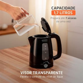 Com capacidade de 1,7 L, é possível fazer até 7 xícaras de chá de uma única vez. E seu visor transparente facilita o controle do nível de água. O sistema de aquecimento rápido reduz o consumo de energia ao ferver a água em poucos minutos. O filtro removível retém impurezas e facilita a higienização.