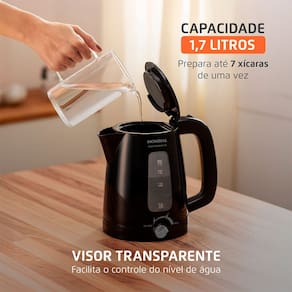 Controle de temperatura ajustável até 100 °C, atinge 70 °C para chimarrão/chá/café e 40 °C para higienização de mamadeiras. Capacidade de 1,7 L (até 7 xícaras). Visor transparente. Sistema de aquecimento rápido. Filtro removível. Jarra destacável. Tampa Abre-Fácil. Botão ON/OFF. Desligamento Automático. Porta-fio., Controle de temperatura ajustável até 100 °C, atinge 70 °C para chimarrão/chá/café e 40 °C para higienização de mamadeiras. Capacidade de 1,7 L (até 7 xícaras). Visor transparente. Sistema de aquecimento rápido. Filtro removível. Jarra destacável. Tampa Abre-Fácil. Botão ON/OFF. Desligamento Automático. Porta-fio.Acessórios