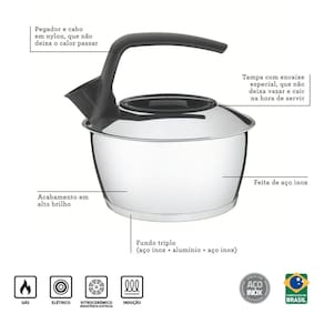 Beleza é acompanhada de segurança total com a Chaleira Tramontina em Aço Inox com Fundo Triplo Cabo Preto 1,5 L. Um produto que une um design sofisticado e elegante.