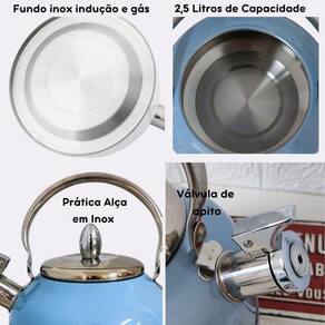 A Chaleira Inox com Apito de 2,5 litros tem um Lindo Design Retrô trazendo elegância e sutileza ao ambiente. Possui alça e tampa em inox brilhante e pintura especial e forma ergonômica que maximiza seu conforto levantar, despejar e encher, atributos que reforça a qualidade do produto