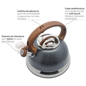 Com 2,7L de capacidade, a chaleira é perfeita para o uso no dia a dia, é feita em aço inoxidável, material que não possui porosidade e por conta disso não acumula cheiro e resíduos, possui revestimento externo na cor granito dando um charme a mais em suas reuniões com amigos e familiares.