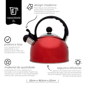 Chaleira funcional para ferver água, além de possuir alça anatômica proporcionando pega confortável. A tampa do bico com dobradiças apita para alertar quando a água está fervendo, e abre para um derramamento fácil e suave. Possui uma base que maximiza a condução de calor. Tampa autovedante que oferece uma vedação 100% para aumentar a eficiência de ebulição.Seguro para uso em fogão a gás e elétrico para aquecimento rápido de água.