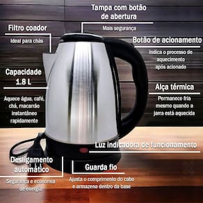 Feita para quem valoriza conforto e eficiência, ela une design moderno com funcionalidade inteligente. Nada de esperar o fogão esquentar ou ficar de olho para não derramar: Aquece até 1,8L de água em instantes, ideal para chás, cafés, sopas ou até acelerar suas receitas favoritas.