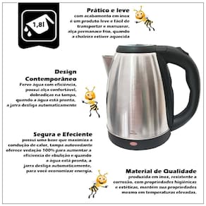 Chaleira Jarra Eletrica Desligamento Automático 1,8 litros Fácil Abertura Tampa Alça Ergométrica 220v Aço inox 1150w