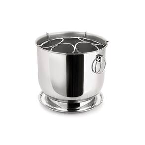 Possui formato redondo com belíssimo acabamento brilhante no lado externo e na divisória, além de um acabamento escovado no lado interno.